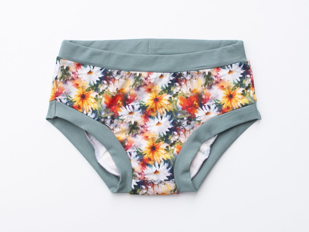 Dívčí kalhotky mají krátký přední i zadní nepropustný klín, podobný, jako u menstruačních kalhotek.